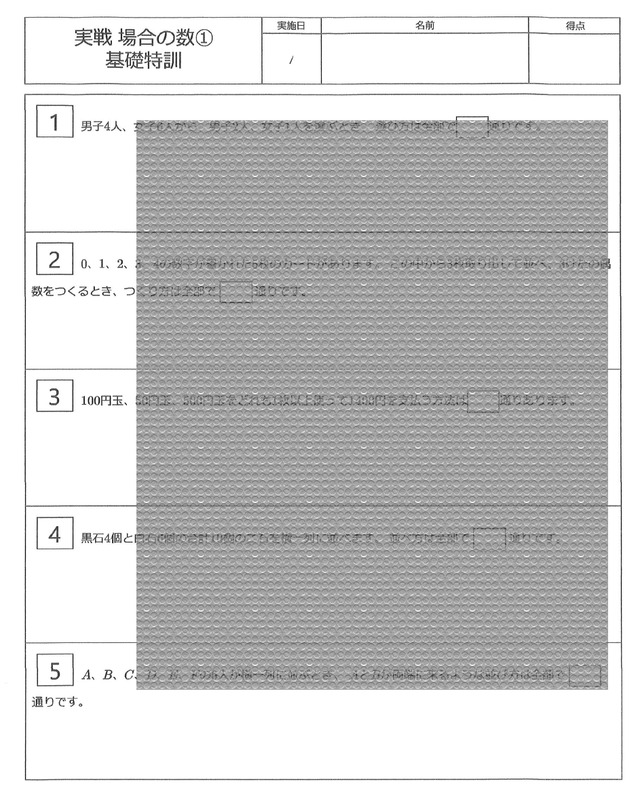 ------ 対象 ------ 小学5年生 「場合の数」学習後 (計算含む) 偏差値45~55 ------ 注意事項 ------ 単純な計算だけではなく 思考を試す問題が含まれます。 場合の数が苦手な型は「場合の数①」から 取り組むことをお勧めします。 解き直し問題の一部は数値を変えられないため 同じ問題が掲載されています。